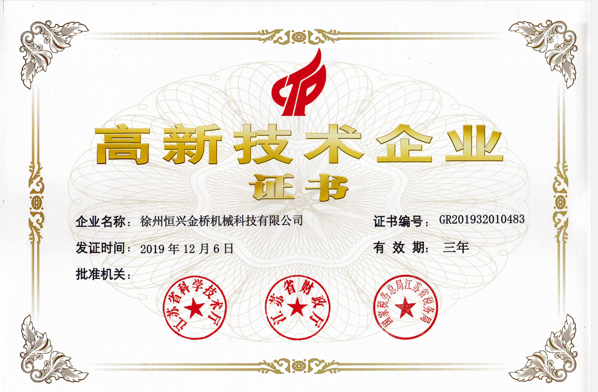國家級高新技術企業資質是企業的重要衡量標準,屬于企業無形資產,證書的含金量很高,是企業自身實力的體現:徐州恒興金橋機械科技有限公司將一如既往的遵循;“客戶第一,團隊合作 擁抱變化 誠信 激情 敬業”的企業價值觀。努力提高自身市場形象,社會知名度,增加 客戶信任感。繼續發揮創新意識、市場開拓能力和經營管理水平。做不負國家重點支持的具有高成長性的企業。用心服務每一位支持信賴恒興公司的客戶!