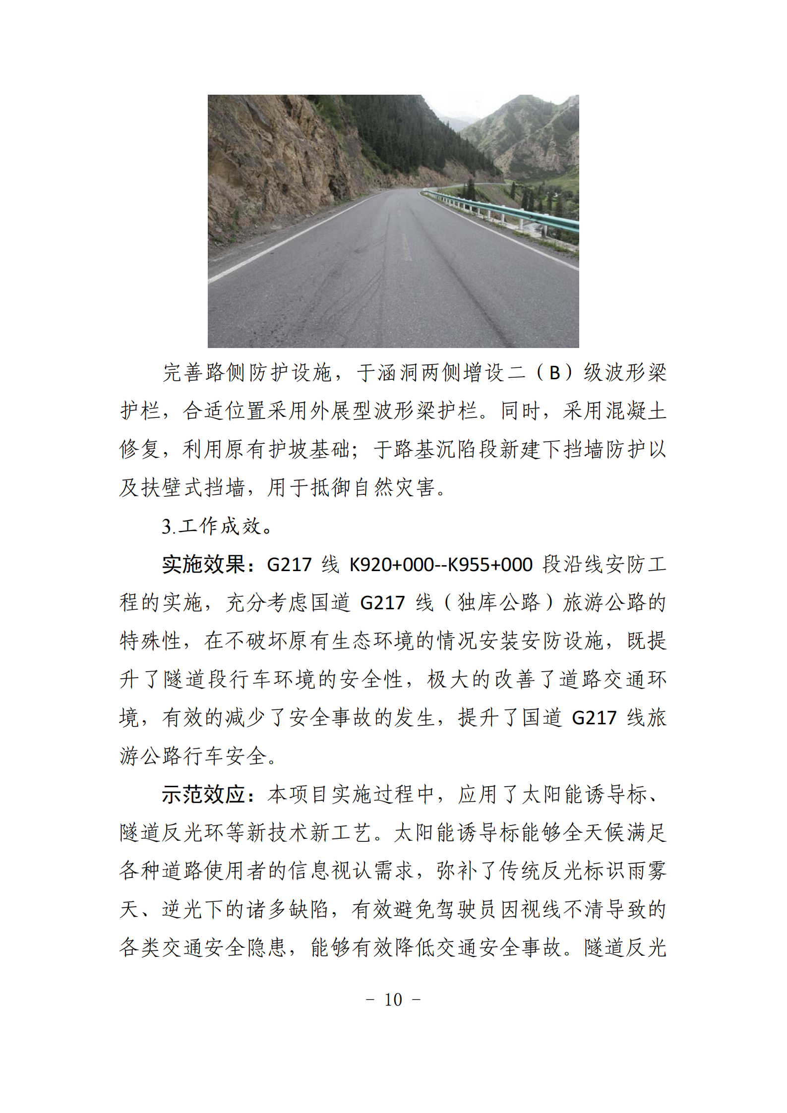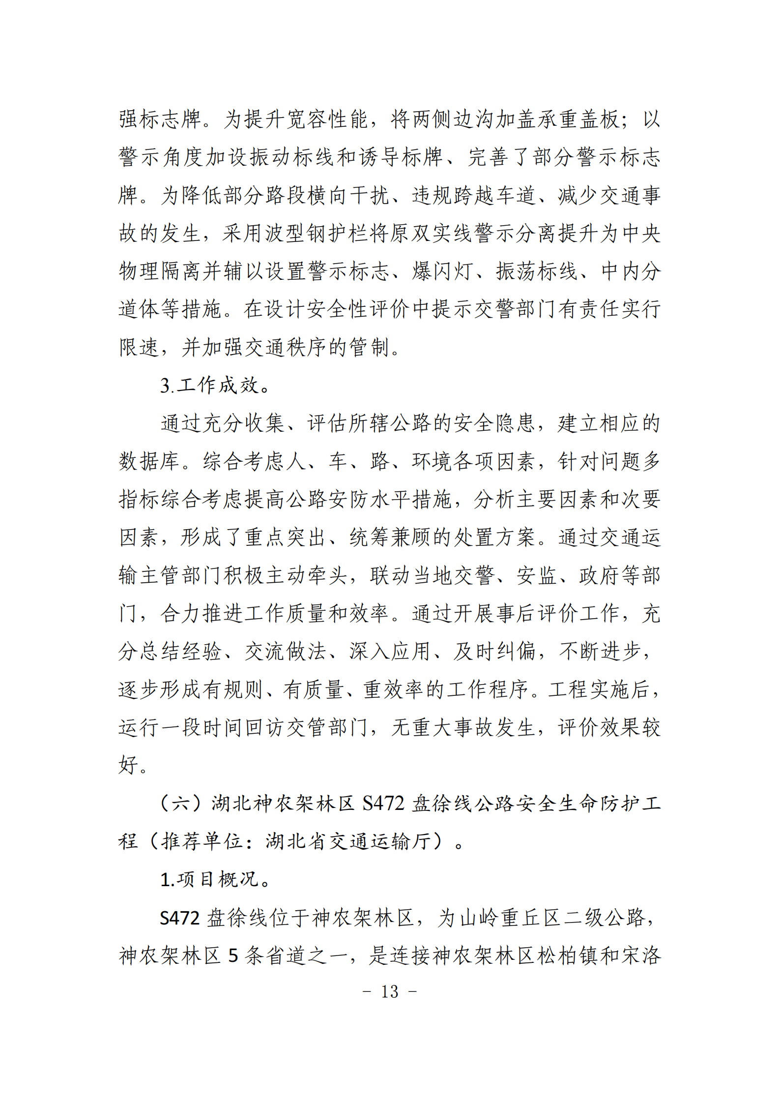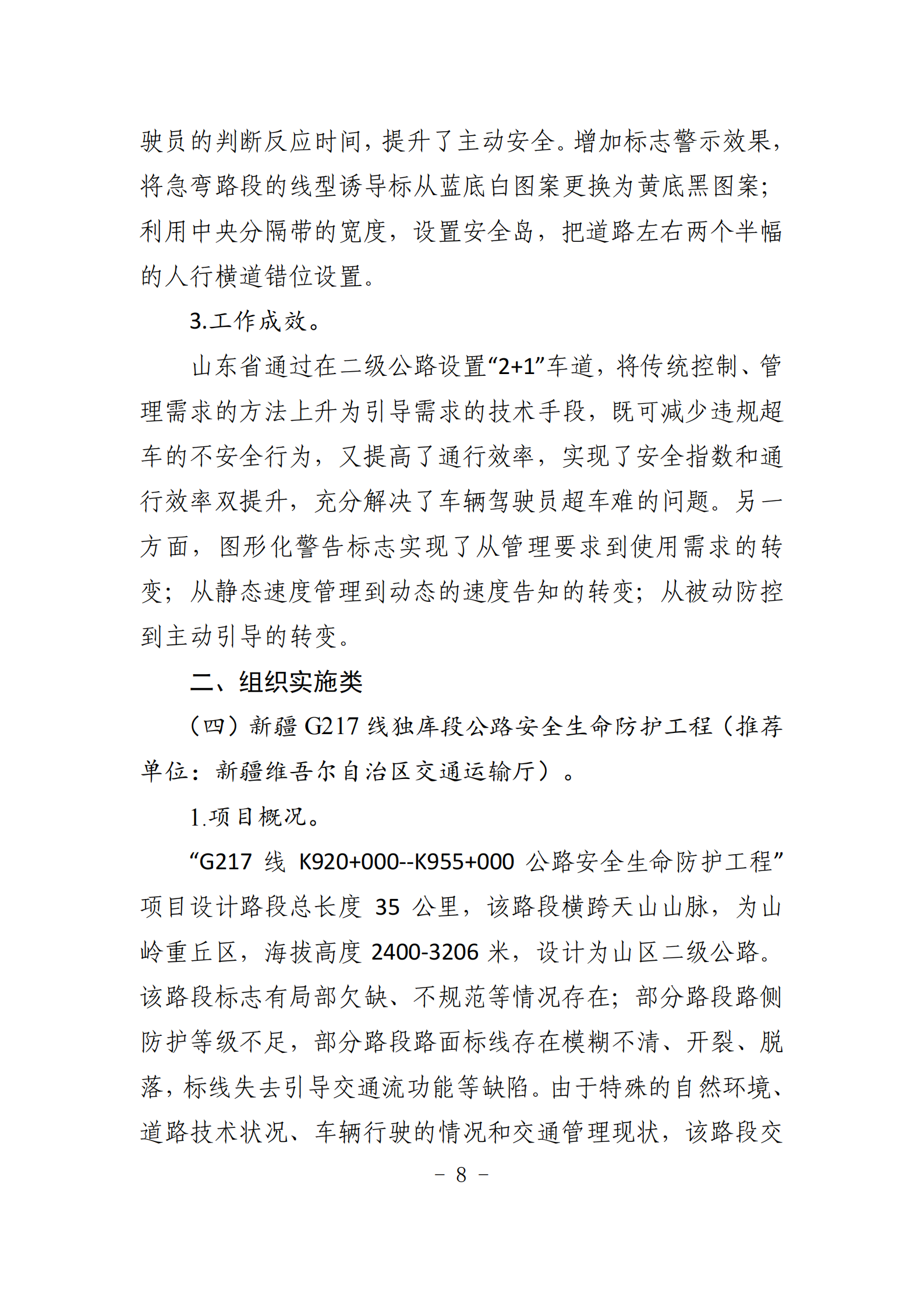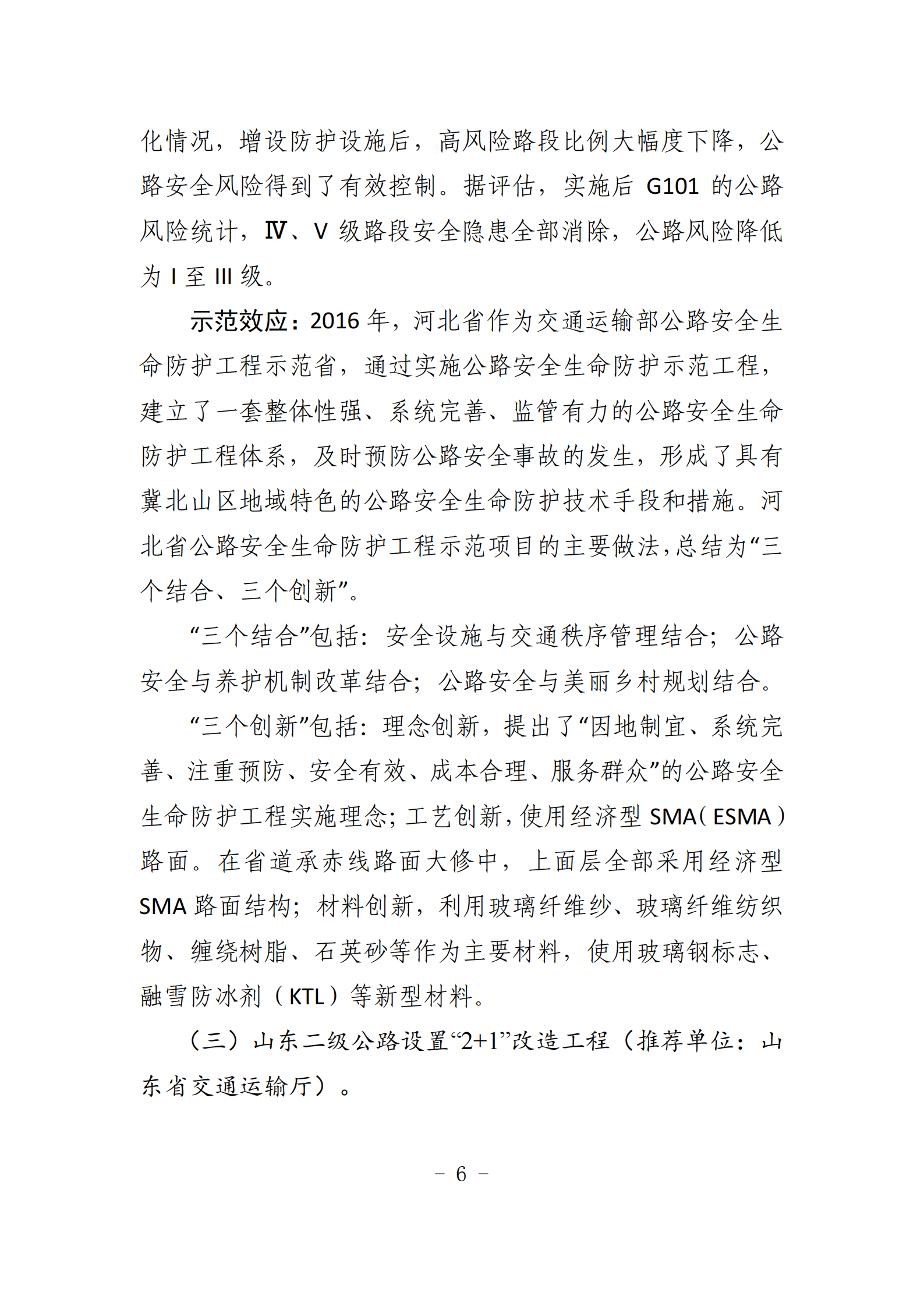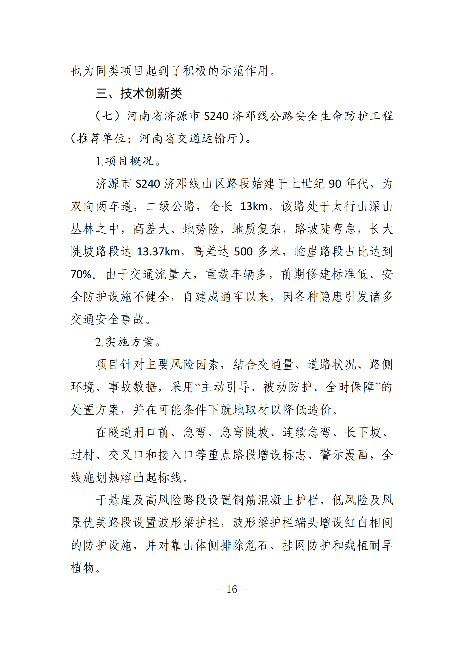黨中央、國務(wù)院高度重視公路安全工作。“十三五”以來,按照部統(tǒng)一部署,各地區(qū)公路安全生命防護工程、危橋改造工程和干線公路災(zāi)害防治工程(以下統(tǒng)稱三項工程)取得積極成效,實施了一批理念先進(jìn)、功能齊全、措施耐久、技術(shù)創(chuàng)新的精品工程、平安工程、放心工程。為挖掘、總結(jié)、推廣各地三項工程成功經(jīng)驗和典型做法,部在前期征集的基礎(chǔ)上,經(jīng)組織推薦、專家評審、現(xiàn)場復(fù)核等程序,形成全國公路安全生命防護工程典型案例10項(綜合類3項,組織實施類3項,技術(shù)創(chuàng)新類4項),全國危橋改造工程典型案例12項(制度建設(shè)類1項,組織實施類4項,技術(shù)創(chuàng)新類7項),全國干線公路災(zāi)害防治工程典型案例8項(綜合類1項,組織實施類3項,團隊建設(shè)類1項,技術(shù)創(chuàng)新類3項)。希望有關(guān)交通運輸部門再接再厲,進(jìn)一步加強組織領(lǐng)導(dǎo)和責(zé)任落實,持續(xù)動態(tài)完善,健全長效機制,積極推進(jìn)公路高質(zhì)量發(fā)展。各級交通運輸主管部門要學(xué)習(xí)借鑒典型案例的經(jīng)驗做法,不斷創(chuàng)新提高,持續(xù)做好項目前期、工程設(shè)計、工程質(zhì)量監(jiān)督、資金管理及工程驗收等工作,全面提升公路安全保障水平,為人民群眾安全便捷舒適出行提供堅實的交通運輸保障。