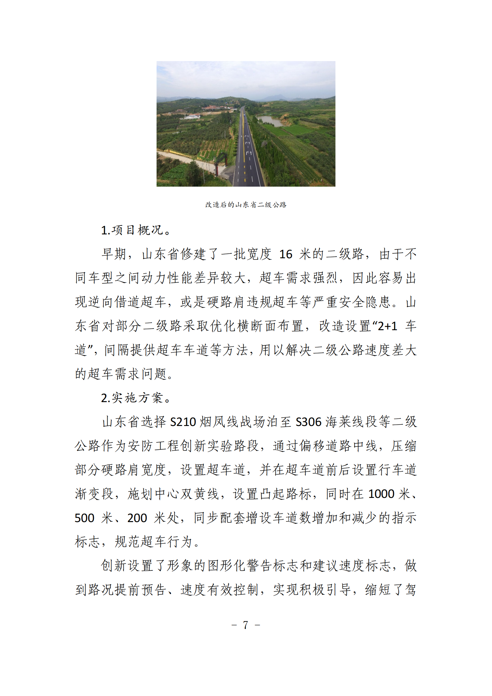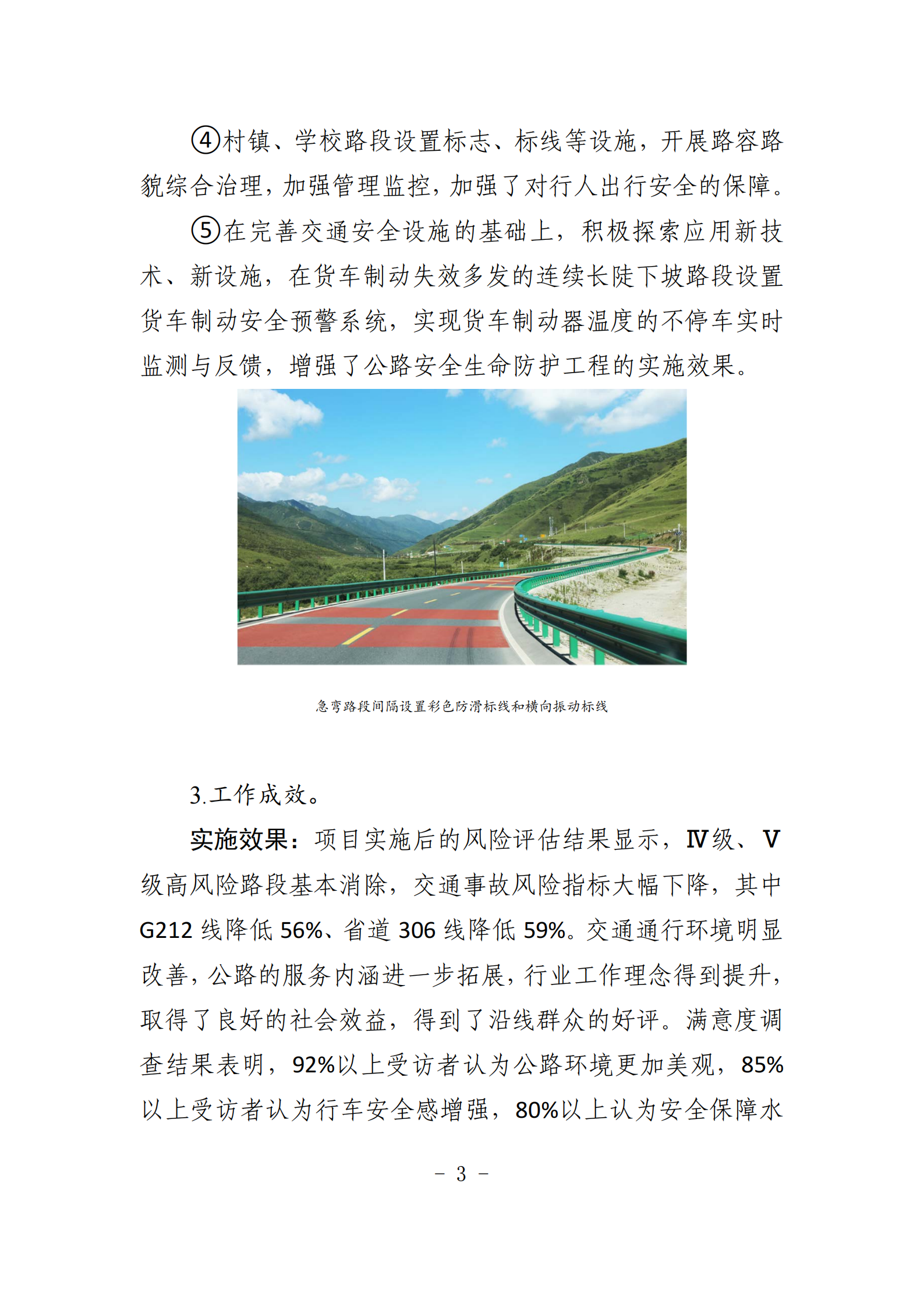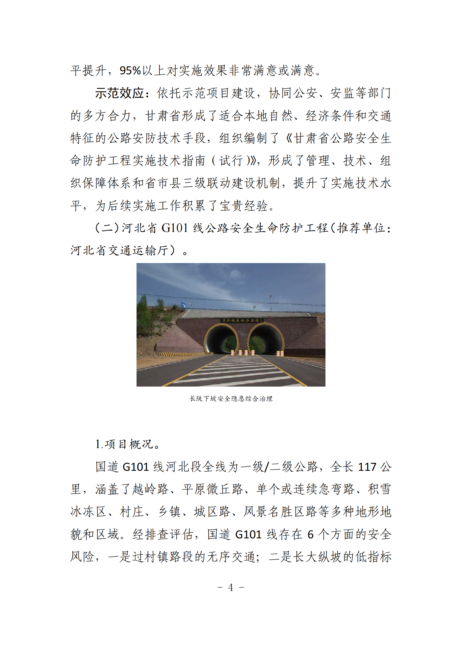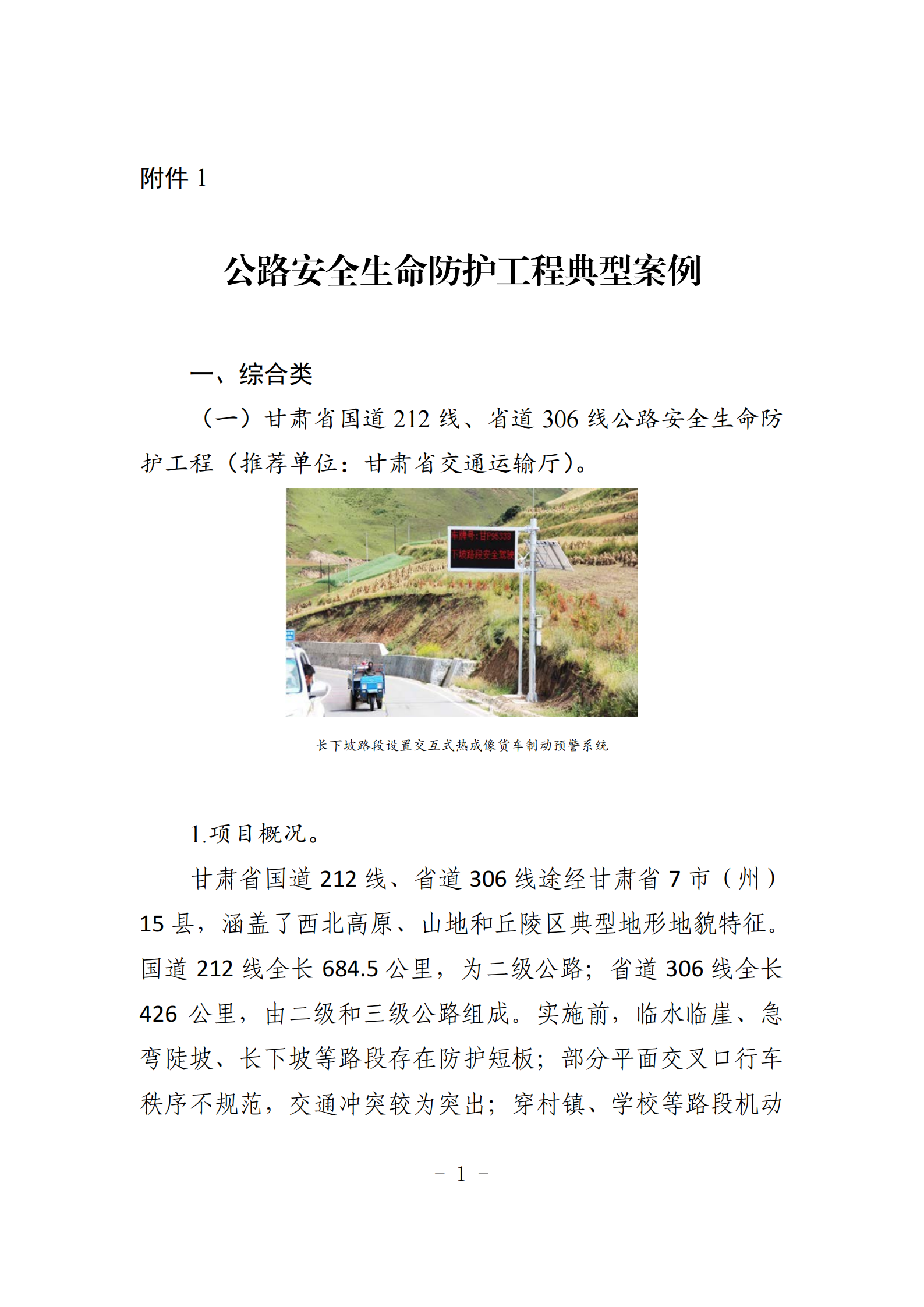 黨中央、國務(wù)院高度重視公路安全工作。“十三五”以來,按照部統(tǒng)一部署,各地區(qū)公路安全生命防護工程、危橋改造工程和干線公路災(zāi)害防治工程(以下統(tǒng)稱三項工程)取得積極成效,實施了一批理念先進(jìn)、功能齊全、措施耐久、技術(shù)創(chuàng)新的精品工程、平安工程、放心工程。為挖掘、總結(jié)、推廣各地三項工程成功經(jīng)驗和典型做法,部在前期征集的基礎(chǔ)上,經(jīng)組織推薦、專家評審、現(xiàn)場復(fù)核等程序,形成全國公路安全生命防護工程典型案例10項(綜合類3項,組織實施類3項,技術(shù)創(chuàng)新類4項),全國危橋改造工程典型案例12項(制度建設(shè)類1項,組織實施類4項,技術(shù)創(chuàng)新類7項),全國干線公路災(zāi)害防治工程典型案例8項(綜合類1項,組織實施類3項,團隊建設(shè)類1項,技術(shù)創(chuàng)新類3項)。希望有關(guān)交通運輸部門再接再厲,進(jìn)一步加強組織領(lǐng)導(dǎo)和責(zé)任落實,持續(xù)動態(tài)完善,健全長效機制,積極推進(jìn)公路高質(zhì)量發(fā)展。各級交通運輸主管部門要學(xué)習(xí)借鑒典型案例的經(jīng)驗做法,不斷創(chuàng)新提高,持續(xù)做好項目前期、工程設(shè)計、工程質(zhì)量監(jiān)督、資金管理及工程驗收等工作,全面提升公路安全保障水平,為人民群眾安全便捷舒適出行提供堅實的交通運輸保障。