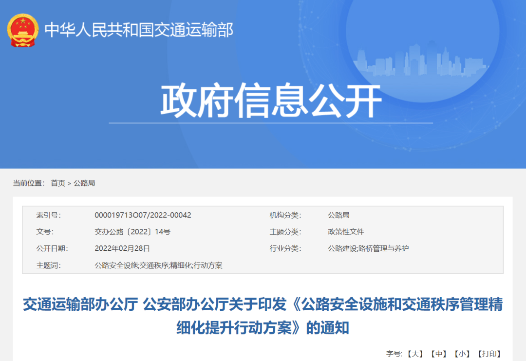 為深入貫徹落實人民至上、生命至上理念,全力保障人民群眾出行安全,持續促進公路交通安全形勢穩定向好,2022年02月28日,交通運輸部、公安部發布了《公路安全設施和交通秩序管理精細化提升行動方案》。
